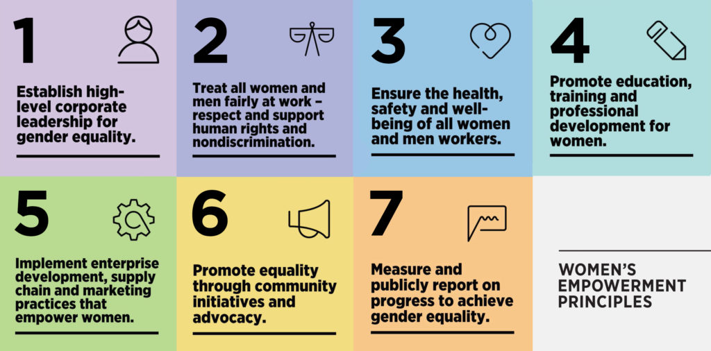 The WEPs encompass seven core principles – high-level corporate leadership; fair treatment without discrimination; employee health, wellbeing and safety; education and training for career advancement; enterprise development, supply chain and marketing practices; community initiatives and advocacy; measurement and reporting.